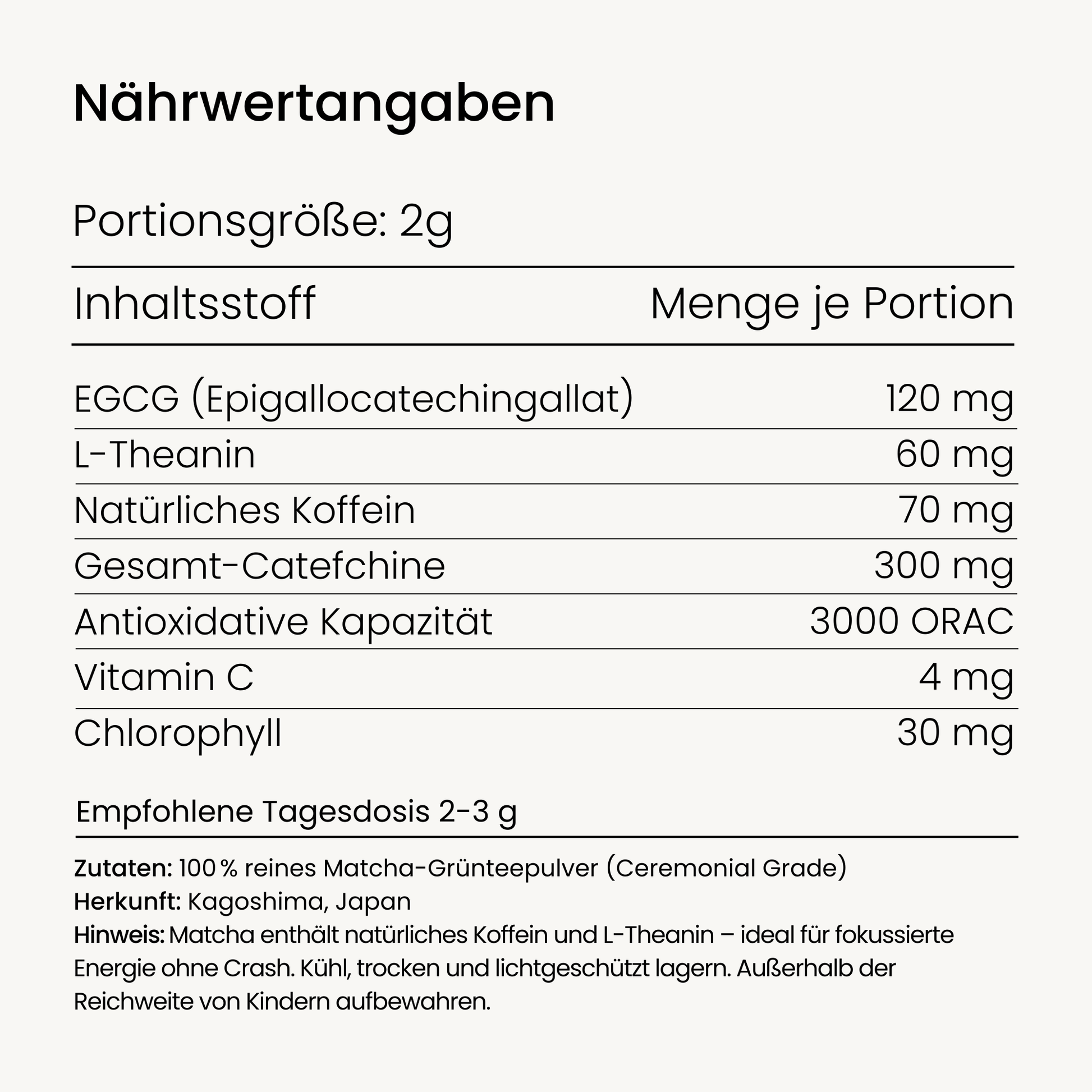 Matcha enthält natürliches Koffein in Kombination mit L-Theanin. Das sorgt für langanhaltende Energie und Fokus, ganz ohne Nervosität oder Energie-Crash wie bei Kaffee.