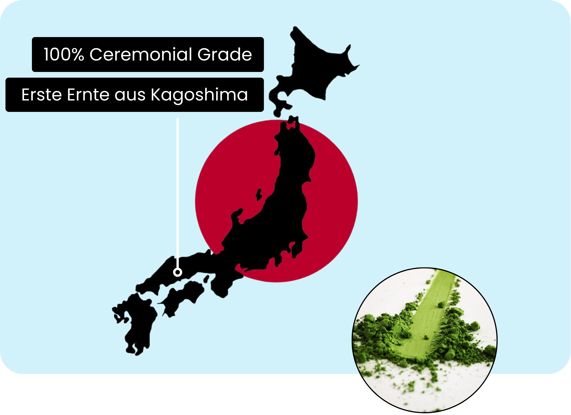Unser Matcha kommt ausschließlich aus Kagoshima im Süden Japans. Dort wird er nach traditioneller Methode angebaut: schattengereift, aus erster Ernte und schonend steingemahlen.